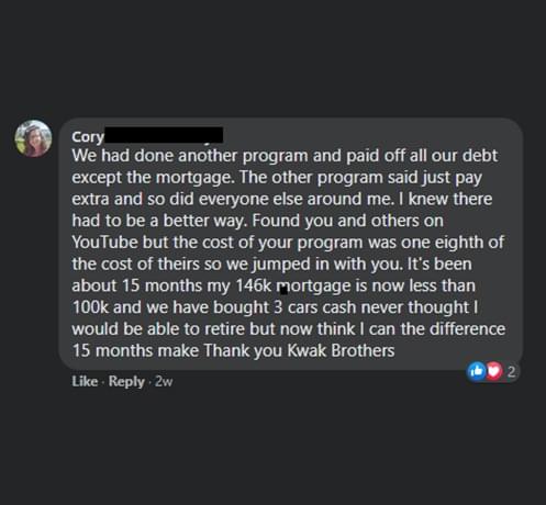 “My husband and I signed up last year and are paying off our mortgage in two months. Their site and program teaches you how to pay less in interest and pay off your mortgage. So valuable! “